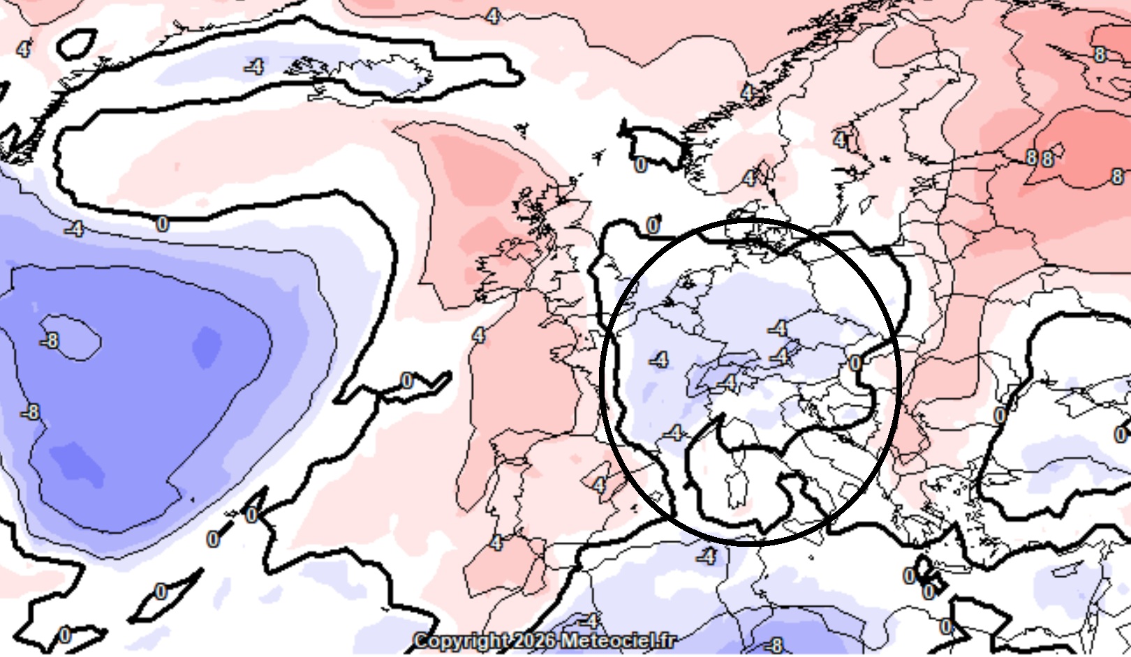 Ipotesi del modello meteorologico europeo, valido attorno al 20 marzo. Come si può notare, saremo nel cuore di una battaglia tra il clima mite in arrivo dal Nord Africa e il freddo invernale continentale. Chi la vincerà?[/caption]